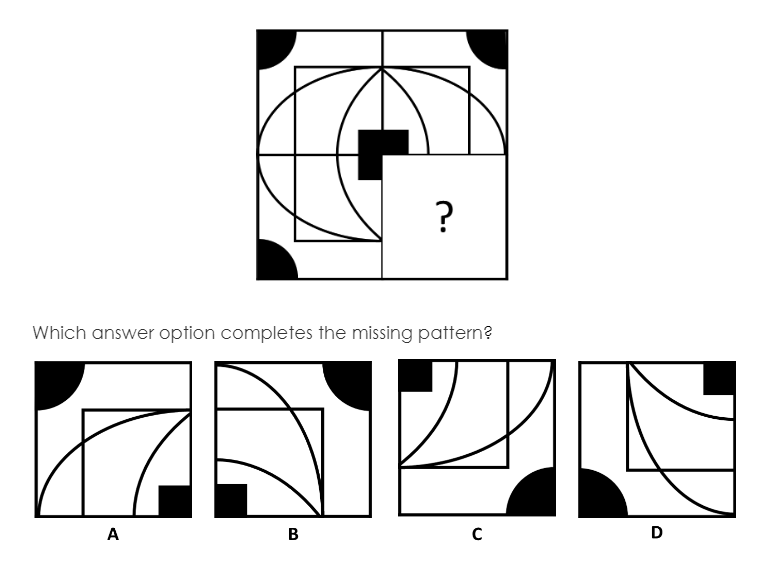 By looking at the given pattern, we can see that the answer pattern must have a quarter square at its top left corner. So, only option C fits to match the pattern.Â