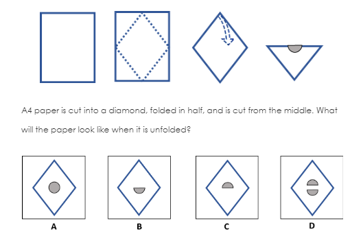 The paper is cut from the middle in the shape of a half circle. This will cut both sides of the paper in half circle shape and when the paper is unfolded, it will have a circle in the middle.Â